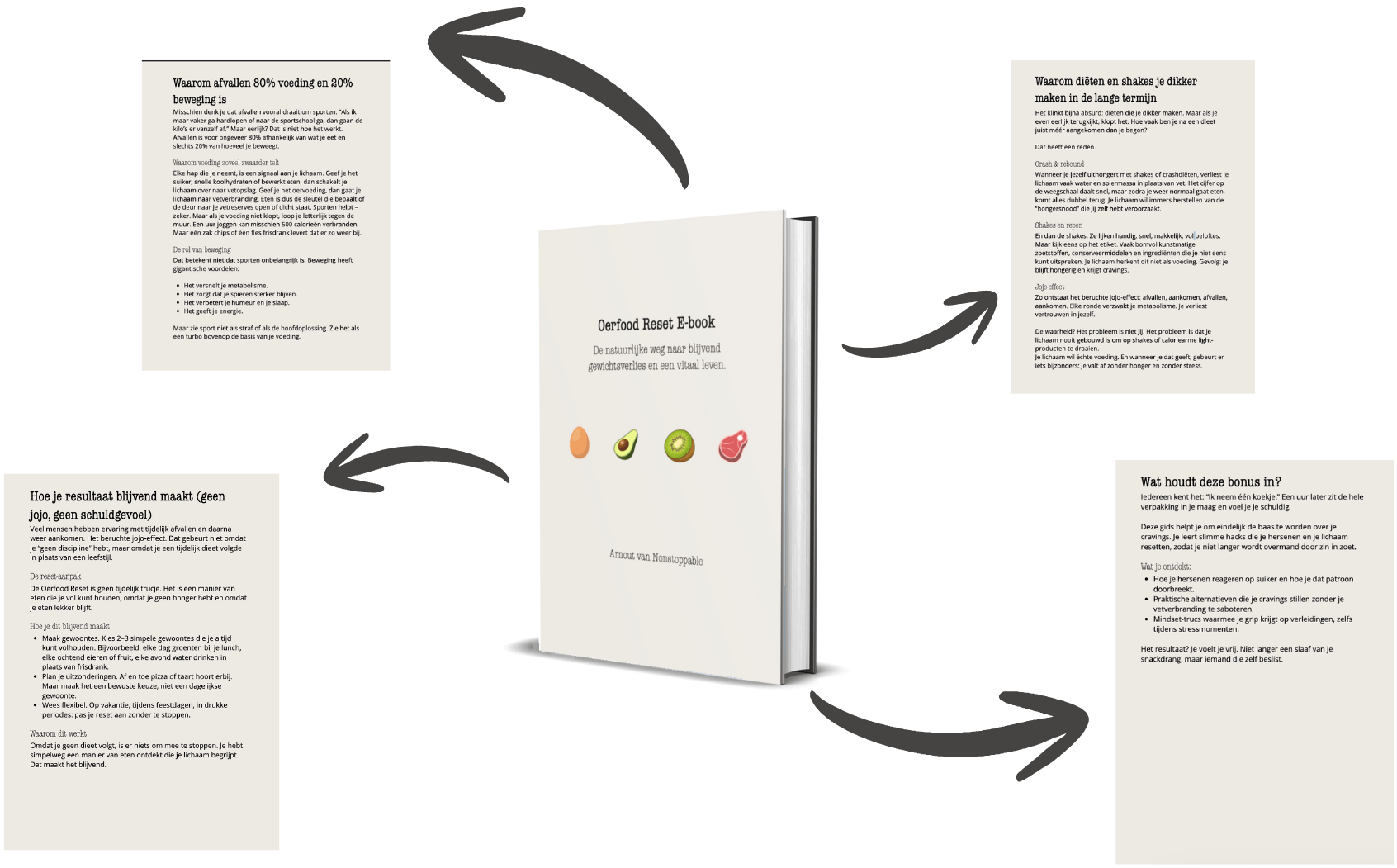 Omdat dit geen dieet is, maar een reset. We gaan je lichaam als het ware terugzetten naar de natuurlijke stand, met echte, volwaardige voeding. Hierdoor verdwijnen de typische valkuilen van diëten: het jojo-effect, constante honger en obsessief nadenken over eten. Het Oerfood Reset E-book is geen tijdelijk trucje, maar een systeem dat je makkelijk kunt volhouden omdat het aansluit bij wat je lichaam echt nodig heeft.